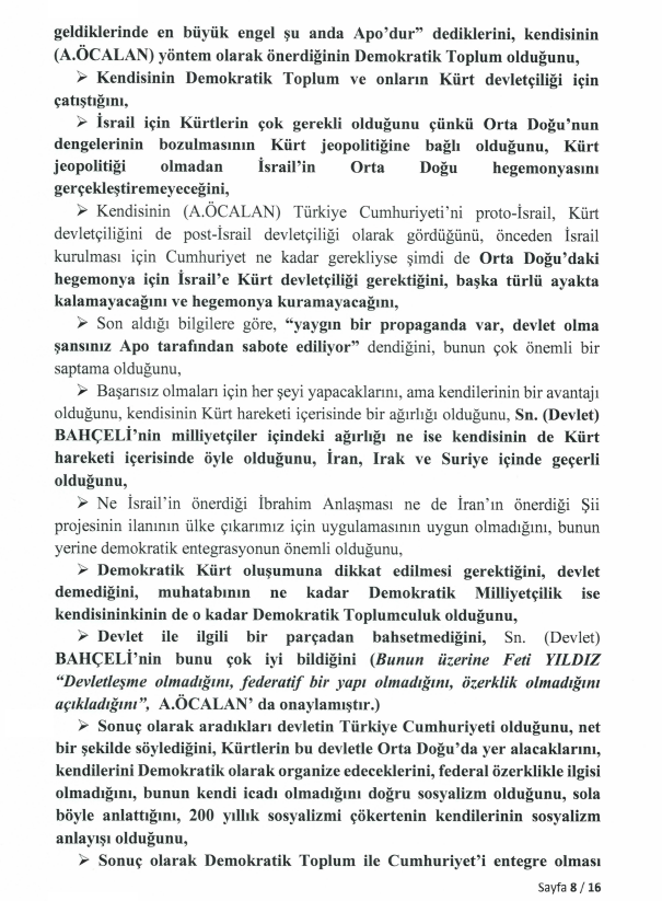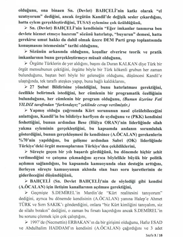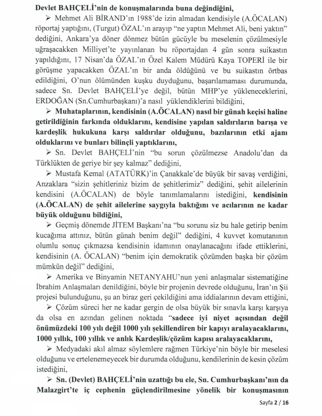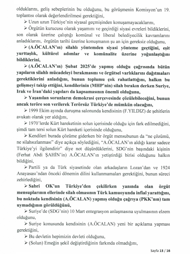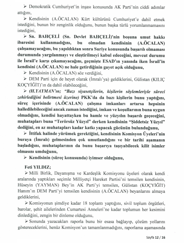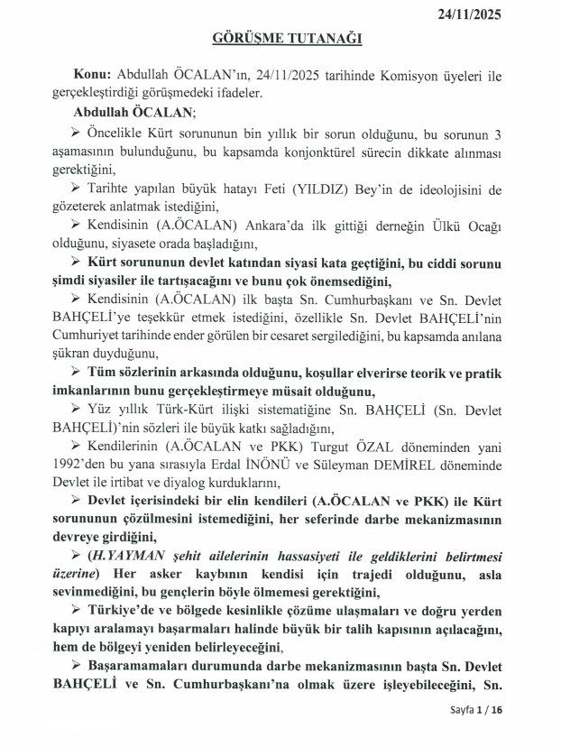 Meclis Milli Dayanışma, Kardeşlik ve Demokrasi Komisyonu üyeleri Hüseyin Yayman (AK Parti), Gülistan Kılıç Koçyiğit (DEM Parti) ve Feti Yıldız’ın (MHP) İmralı Yüksek Güvenlikli Cezaevi’nde gerçekleştirdiği görüşme, TBMM’nin resmi internet sitesinde yayımlandı. 16 sayfalık dökümde, Türkiye ve Orta Doğu’nun geleceğine dair çarpıcı analizler dikkat çekiyor.