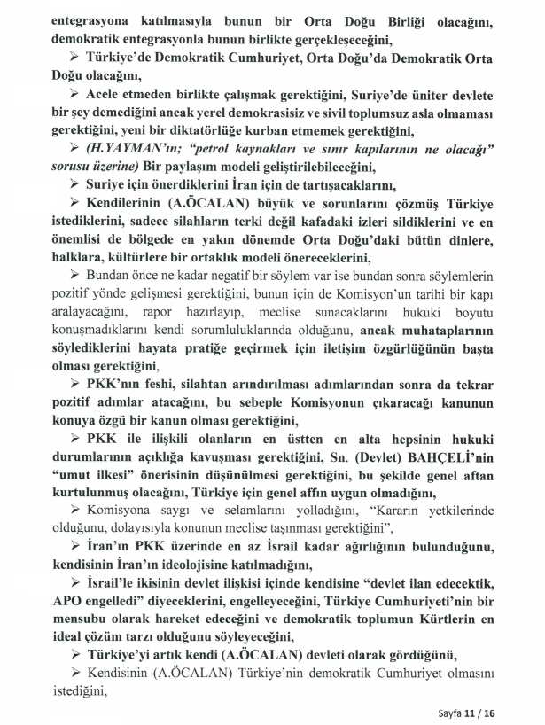 Tutanaklara göre Öcalan, Türkiye ve Orta Doğu için "Demokratik Cumhuriyet" modelini önererek sürecin zamana yayılarak, acele edilmeden yürütülmesi gerektiğini savundu. Suriye meselesine de değinen Öcalan, üniter devlete karşı olmadığını ancak yerel demokrasinin olmadığı bir yapının yeni bir diktatörlüğe kapı aralayacağını ifade etti.